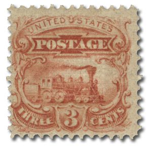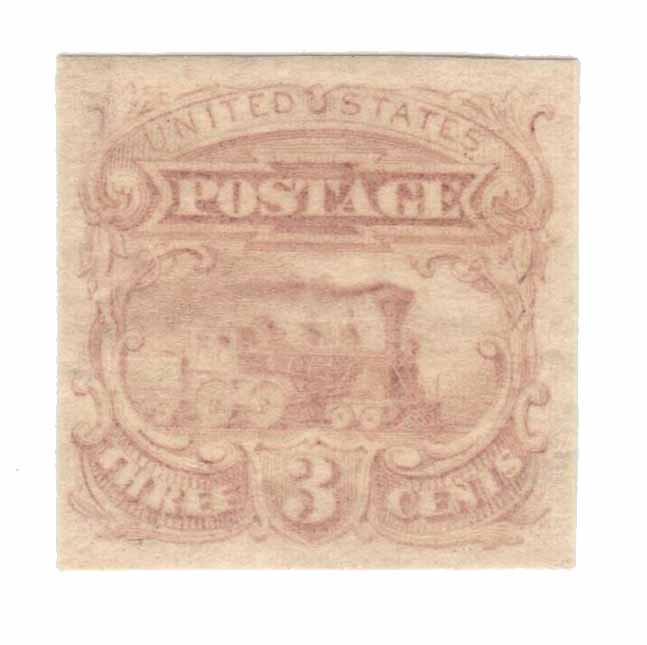 114-E6d – 1869 3c Locomotive Essay, Plate on Stamp Paper, 9x9mm Grill, Perf. 12 With Gum, Various Colors, Mystic’s Choice