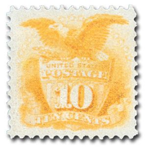 116 – 1869 10c Shield & Eagle, Yellow, Hard Wove Paper, G Grill, Perf. 12