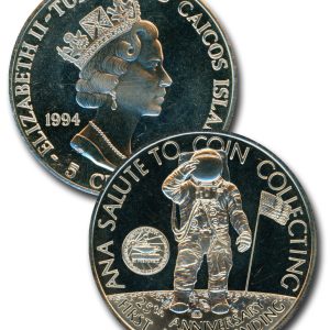 4499123 – 1994 Turks & Caicos 5 Crown – First Lunar Landing 25th Anniversary Coin – ANA Salute to Coin Collecting