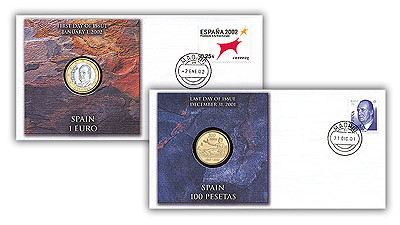4597486 – Spain’s “First and Last Coins of Europe” Covers – 2001 cover with 100 Pesetas and 2002 cover with 1 Euro