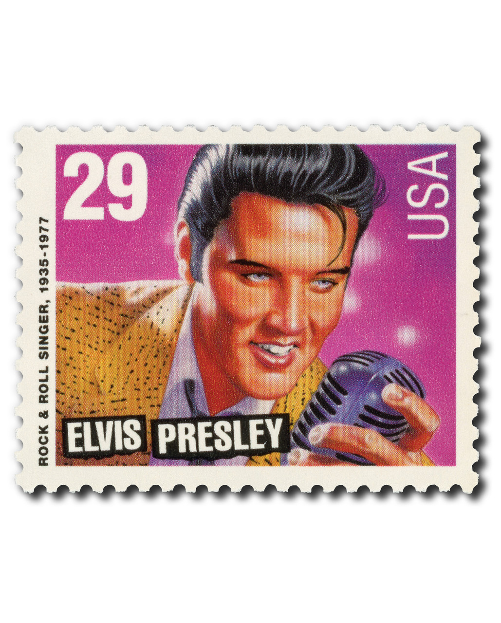 History the stamp represents: When Elvis died in 1977, fans around the nation immediately wanted a stamp honoring him. After ten years, he was eligible to appear on a US stamp, and requests poured in. A decade later, the postmaster general hinted at issuing a stamp to honor Elvis along with other major American music figures. While many people liked the idea of an Elvis stamp, he was also a controversial subject due to his history of drug use. However, after a long debate, Elvis was chosen for the first stamp in the new Legends of American Music Series. The big day came on January 8, 1993, which would’ve been Elvis’s 58th birthday. In all, 517,000,000 million of that first Elvis stamp (#2721) were printed, three times the usual print run for a commemorative. The first Elvis stamp of the Legends of American Music Series is the most widely publicized and best-selling US commemorative in history.