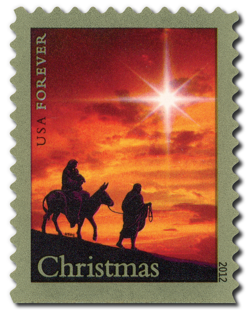 The first U.S. Christmas stamp was issued in 1962. Since then, there have been both religious and contemporary Christmas stamps issued each year. Most of the religious issues have pictured a classical version of the Madonna and Child. The U.S.P.S. decided to take a modern approach to the 2012 Holy Family stamp, inspired by the bible passage, “Out of Egypt I call my Son.”