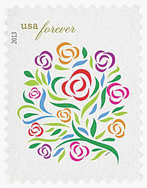 As with the “Yes I Do” Heart of Roses stamp, the “Where Dreams Blossom” Wedding Bouquet stamp was designed by Ethel Kessler using an illustration by Michael Osborne. This stylized bouquet stamp was issued for use on the save-the-date notices, response cards, and thank-you notes.