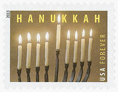 The 2013 Hanukkah stamp features a photograph of a forged-iron menorah created by Vermont blacksmith Steven Bronstein holding nine lighted beeswax candles.  These stamps were put on sale in post offices on November 9, though the first day ceremony took place on the 19th.