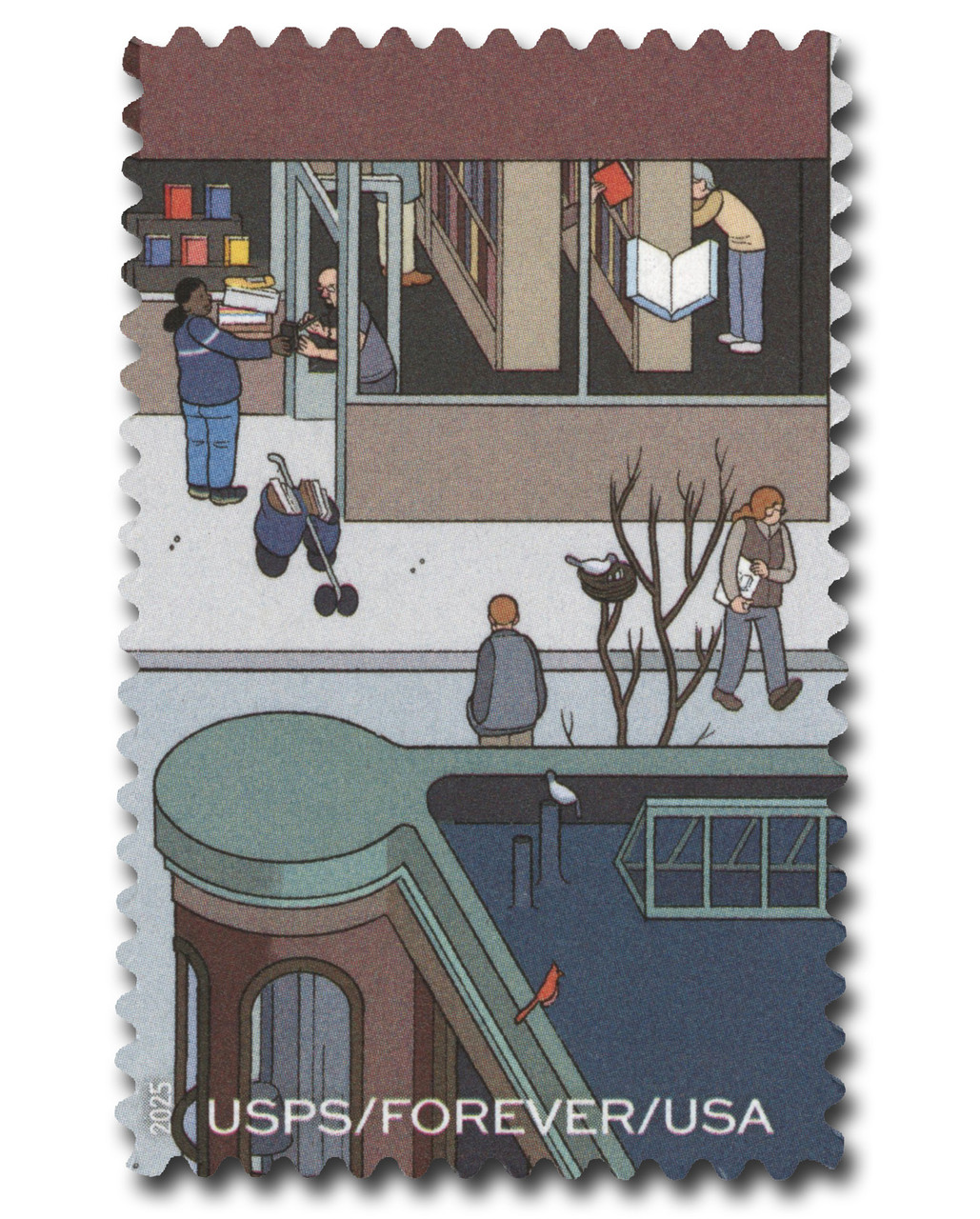 6023o – 2025 First-Class Forever Stamp – 250th Anniversary of Delivering Mail: Postal Worker Delivering Parcel to Book Store