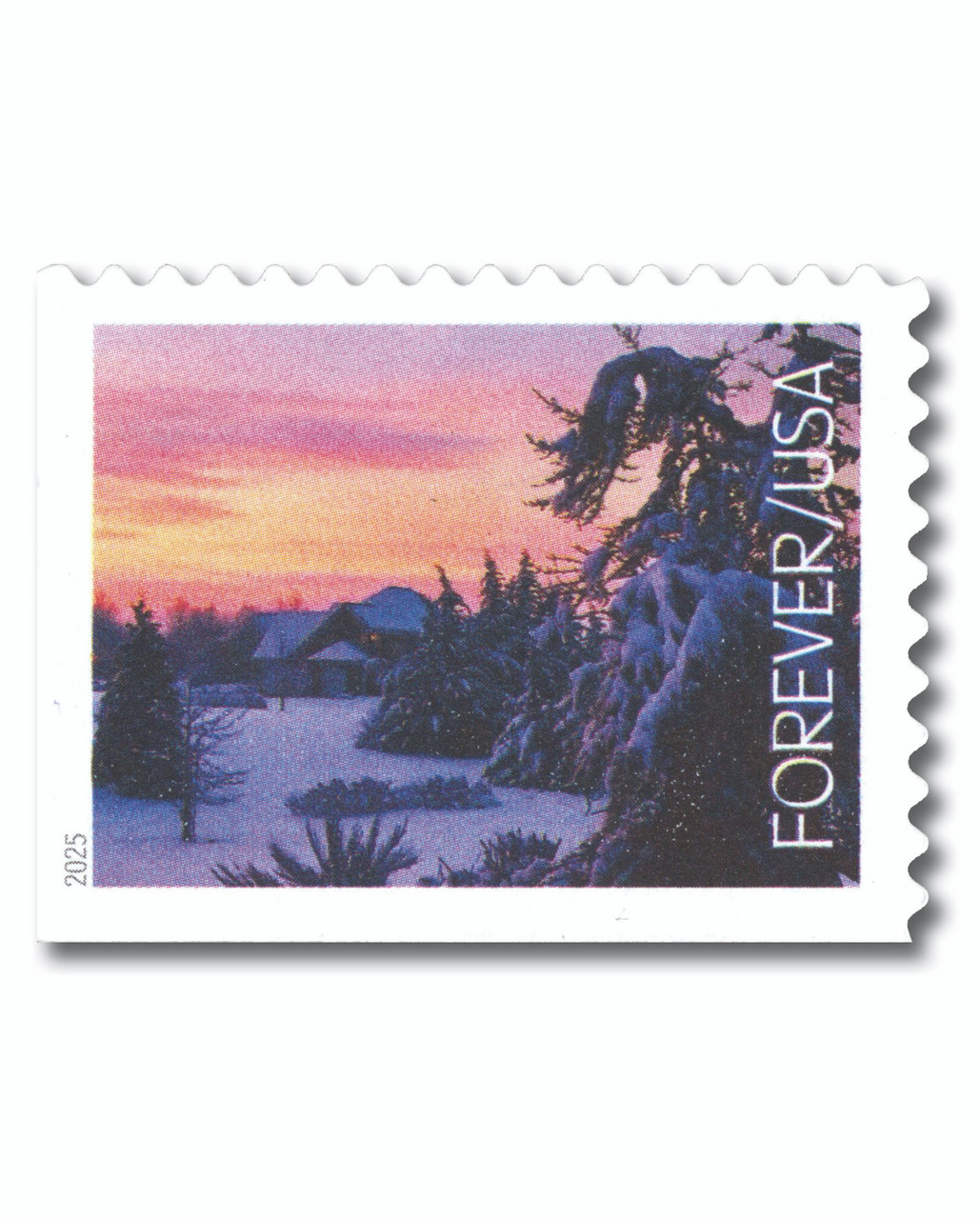 6038 – 2025 First-Class Forever Stamp – House and Snow-Covered Trees at Twilight