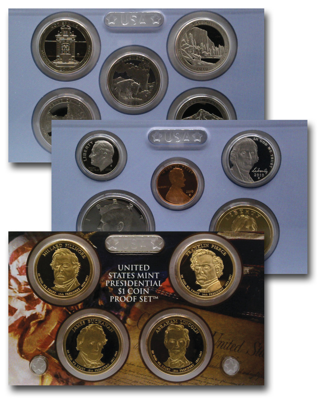 This set contains every proof coin denomination issued in 2010.  This includes the first coins in the America the Beautiful Quarters Program, the second coin in the Sacagawea (Native American) Dollar program, and a set of four Presidential Dollar coins.