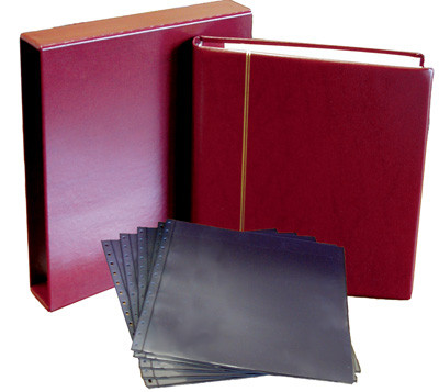 Produced by SAFE, the leading German manufacturer of collecting supplies, this deluxe handmade album is the home your collection deserves.  Features a richly padded cover and a 2 1/4" 14-ring mechanism that won’t tear your pages, but lets them lie flat for easy addition and removal of pages.  Includes five two-sided clear archival-quality pages to keep your stamp sheets secure and a slipcase durable enough to withstand years of collecting fun.  Sliding tracks make it easy to remove your binder from the slipcase without taking the entire case from the shelf.  Extra pages also available here.