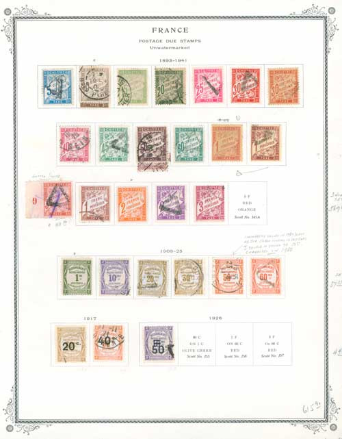 Enjoy significant savings on this high-value France Back of the Book collection. The collection contains 116 stamps – most in postally used condition – and 13 album pages. Noteworthy stamps include #J29-45, the 1893-1941 Postage Due stamps with a combined value over $545. Also includes unused #N1-2 and #7 (value $500). Interesting addition to your collection and a great value.