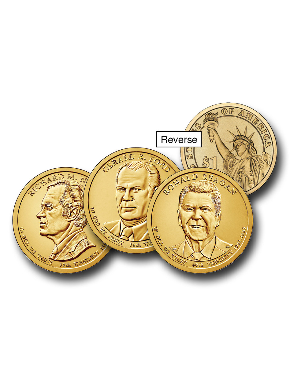 The US Mint issued four Presidential $1 coins per year, each picturing the Statue of Liberty on the reverse side. The size and composition of the Presidential $1 coins is the same as the Sacagawea Golden Dollar and Native American $1 coins.