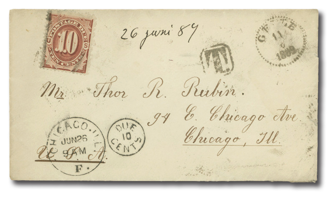1884 10c brown Postage Due on cover with black “GEFLE 11 6 188” dotted circular date stamp in upper-right corner with black framed “T” nearby. Black “CHICAGO, ILL JUN 26 9 AM F. DUE 10 CENTS” hand stamped in lower-left corner. Stamp has well-known black wavy line precancel of Type F variation. Reverse has black double line “PKXP. NO 2 C. UTR. N. 13 6 1889” Swedish railroad transit marking.