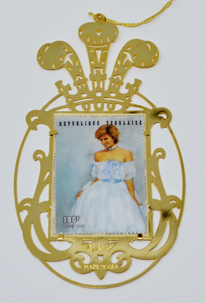 This decorative collectible features a postage stamp from Togo honoring Princess Diana. The stamp has been framed in a gold-colored filigree ornament, specially designed for display or as a commemorative holiday piece.