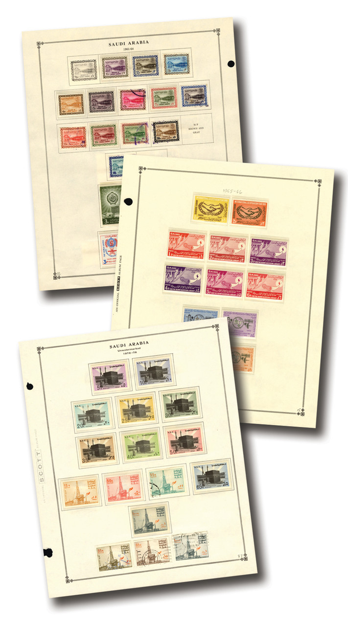 300+ mint and used Saudi Arabia stamps, 1916-90. Sets and singles. Some Airmail, Postage Tax, and Postage Due stamps. On 25-30 album pages. Scott Catalog value $1,482.