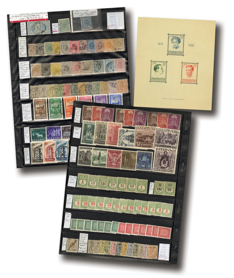 130+ mint and used Luxembourg stamps, 1872-1957. In stock pages. Scott Catalogue value $2,484.