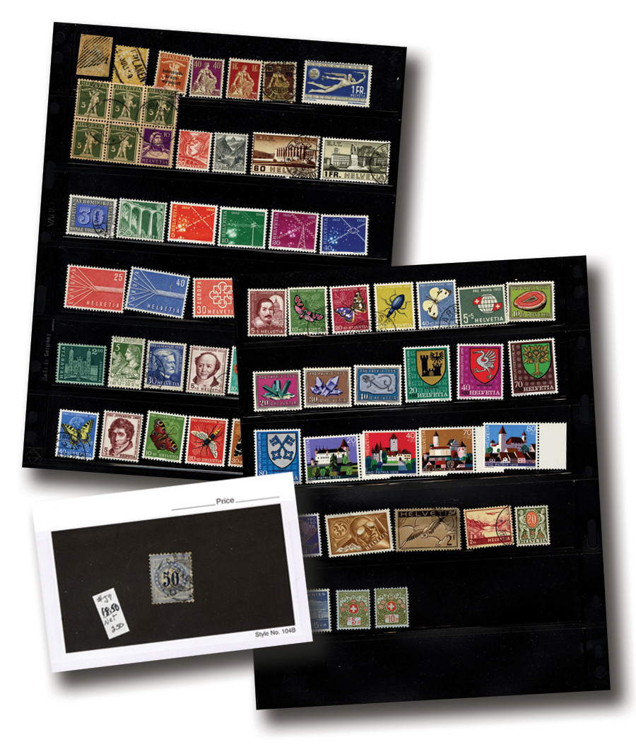 70+ Switzerland stamps, 1854-1960s.  Inblack pages and mylar cards.  Scott Catalogue value $520.