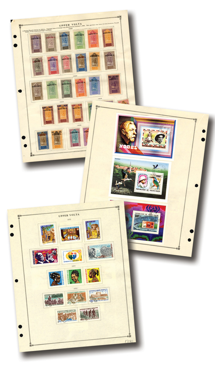 800+ Upper Volta stamps, 1920-1976. Singles and sets. On Minkus, Scott, and generic album pages. Scott catalog value $1,000+.