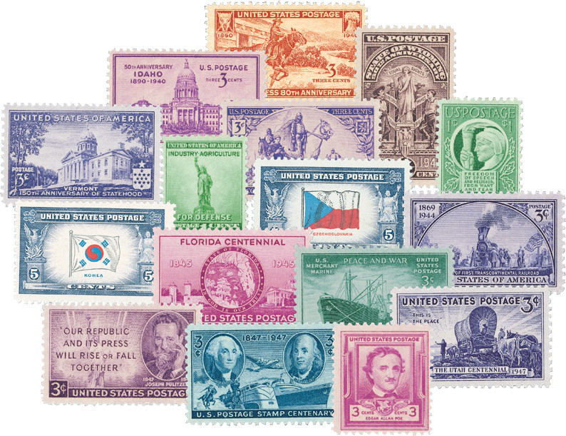 Includes all 129 commemorative stamps issued in the 1940s. It’s an easy and time-saving way to get them all in one convenient order. Plus you save money compared to buying the stamps individually.