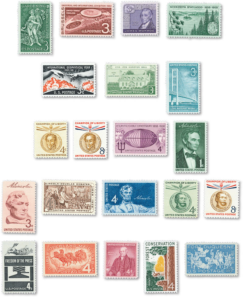 Now you can own all 21 commemorative stamps issued in 1958 with one money-saving order. (Note: YS1958C contains the same stamps as YS1958.)